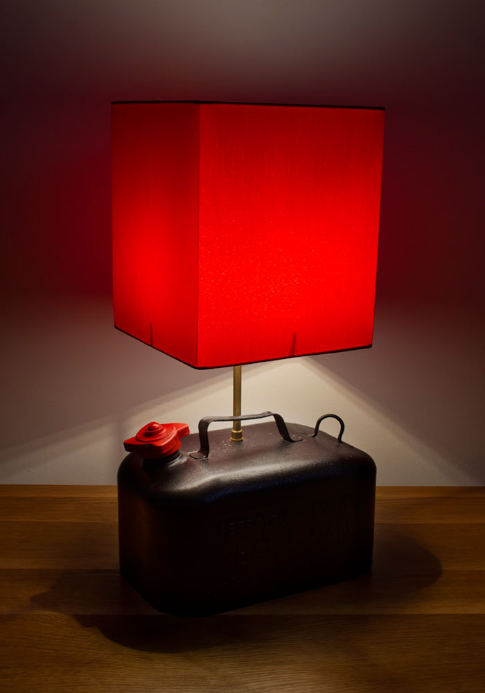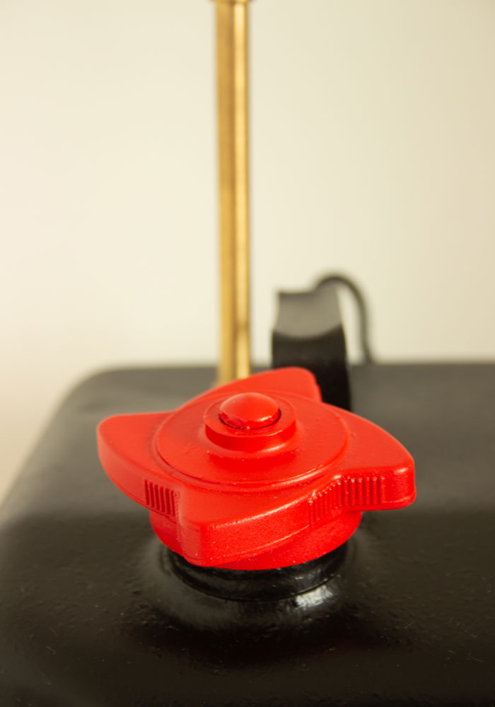 A bespoke, vintage metal Petrol Can converted to a lamp. Painted in Satin Black but retaining its patina with a contrasting red cap. This is the very first lamp we created so would be a very special item to whoever buys it. Shade and Light Bulb not included.