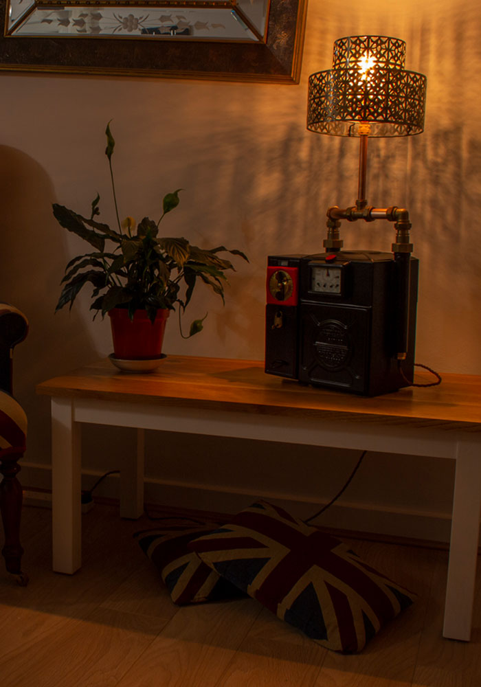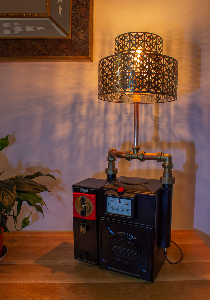 £225.00Original price was: £225.00.£195.00Current price is: £195.00.Add to basketA bespoke, vintage 1961 Gas Meter converted into a table lamp. The second lamp I created, and like everything I make, is a complete original and never to be repeated. Painted in satin black retaining its patina and with red detail on its seal. Shade and Light Bulb not included.