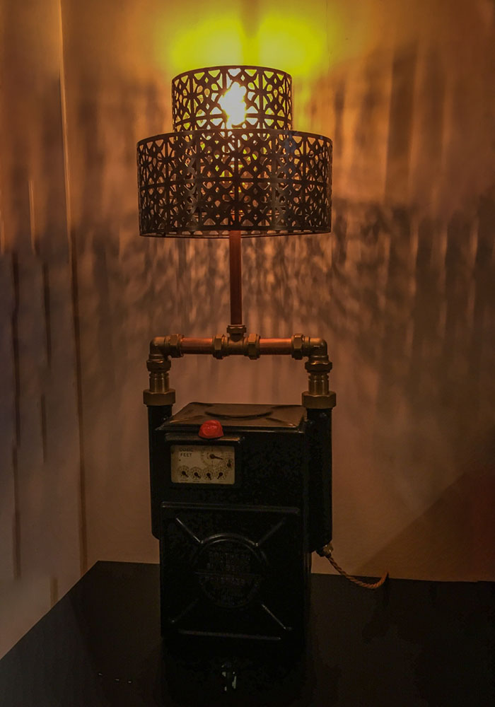 A bespoke, vintage 1961 Gas Meter converted into a table lamp. The second lamp I created, and like everything I make, is a complete original and never to be repeated. Painted in satin black retaining its patina and with red detail on its seal. Shade and Light Bulb not included.